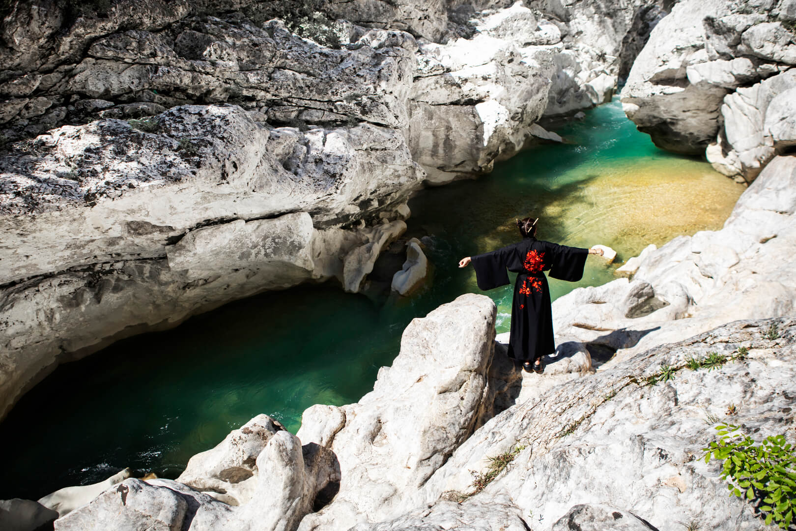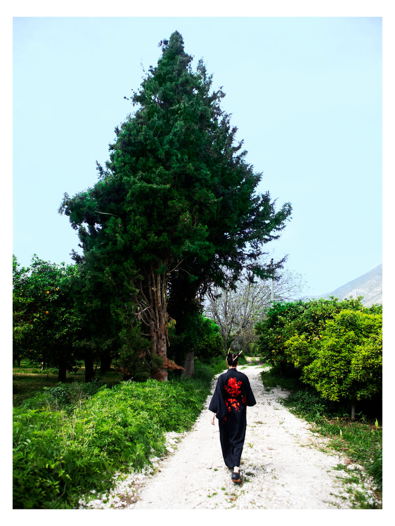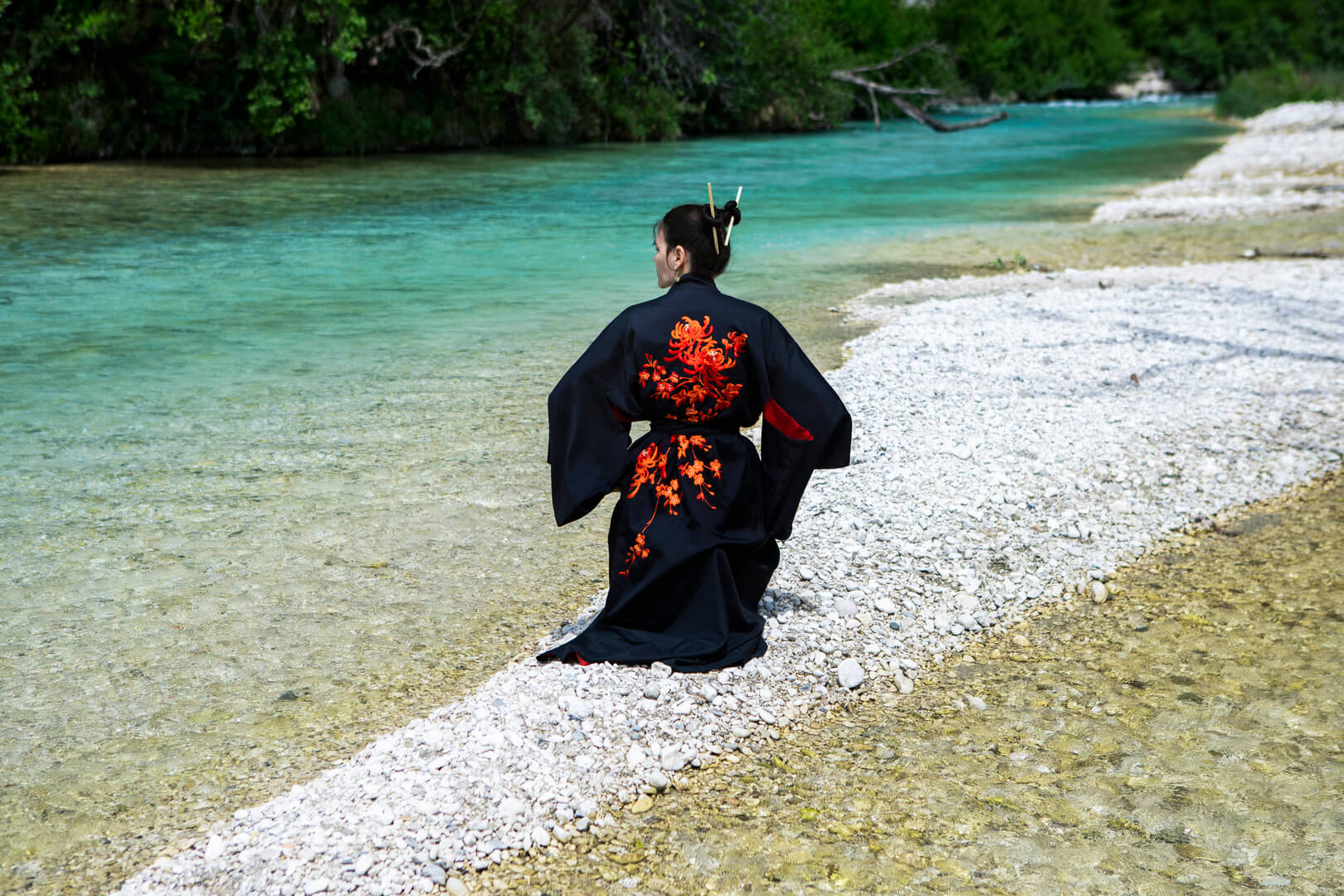 Every morning, she walked to the springs of Acheron in her dark kimono embroidered with red flowers. The river glowed in impossible shades of green and blue, slipping between smooth white stones. Standing there, she felt the myths rise around her—not as tales of death, but of renewal.