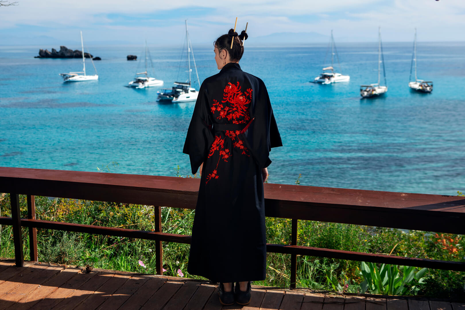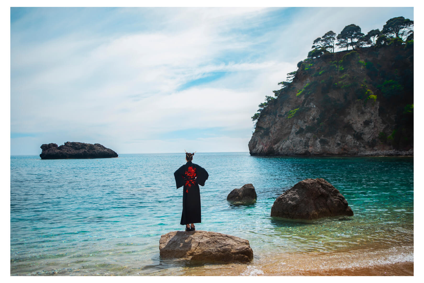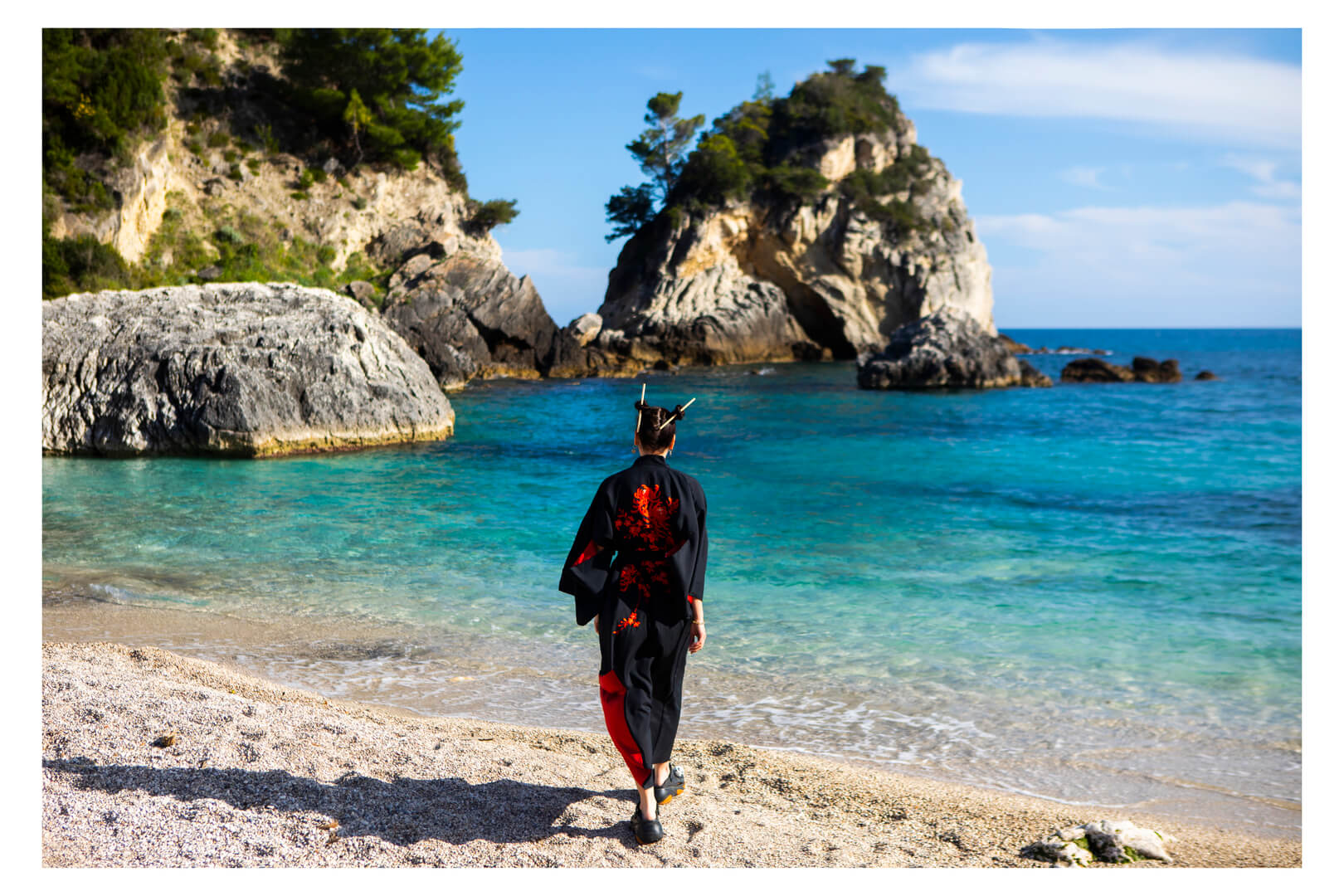 At Skala Beach, she gazed at sailboats drifting across turquoise water, as if inside a watercolor painting.