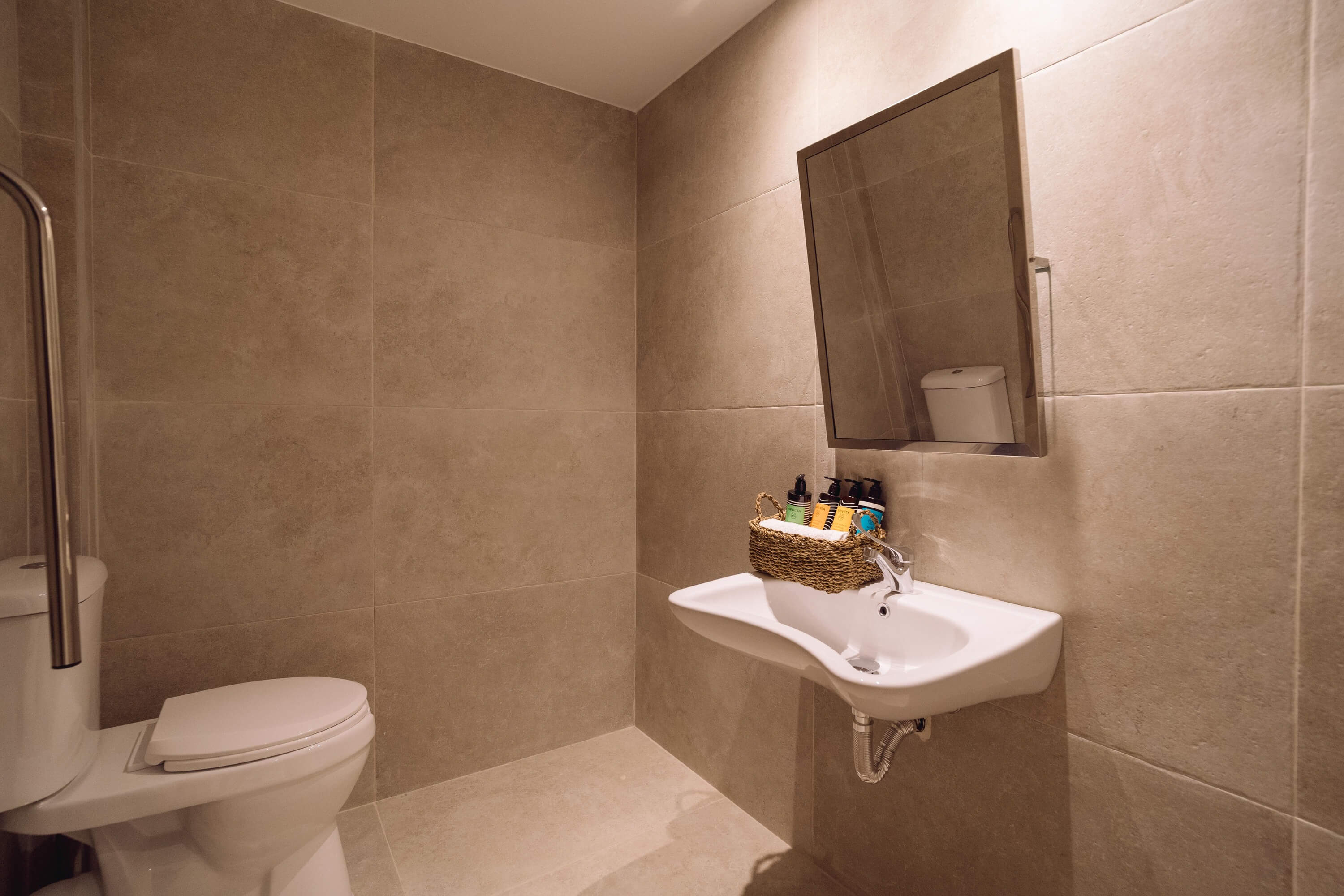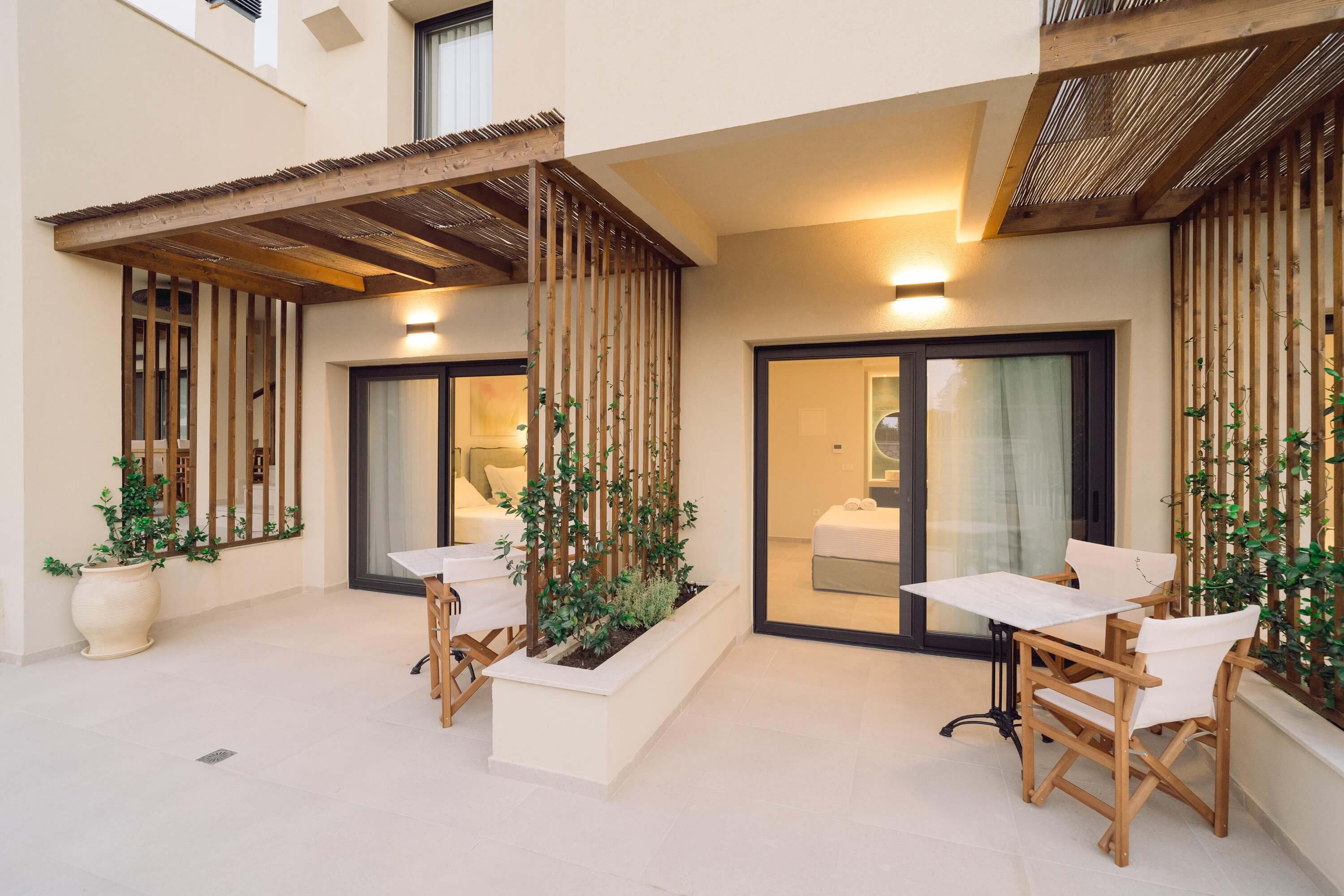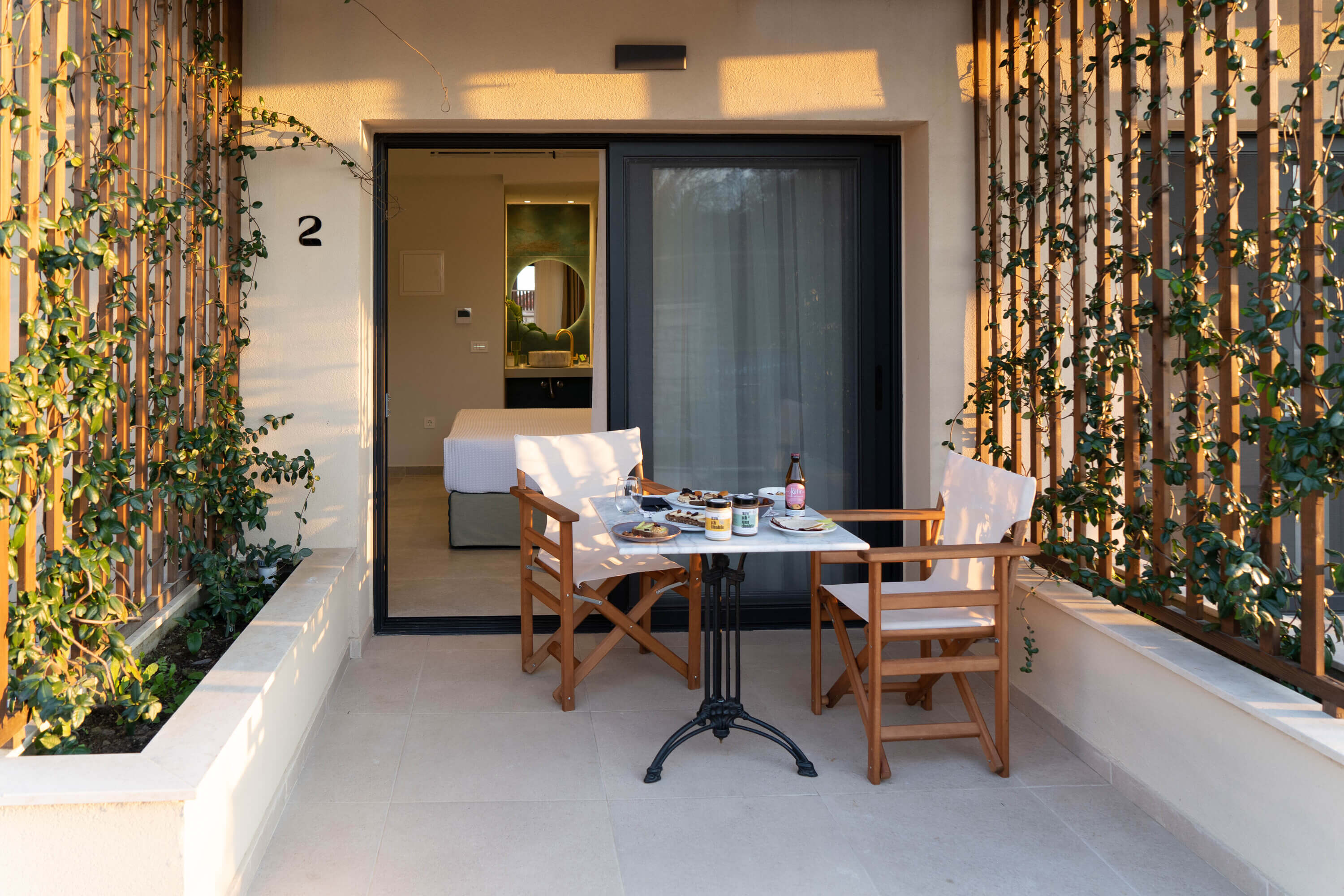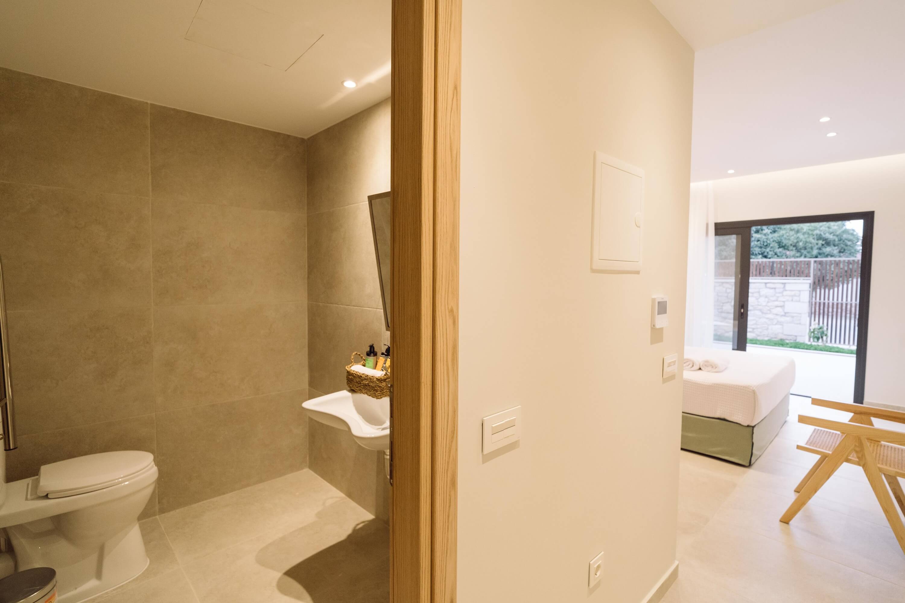 This room can accommodate 2 people in a double bed. There is a separate shower, WC and external sink. The room caters to people with disabilities and mobility issues. In front of the room, there is a private outdoor space shaded by a pergola.