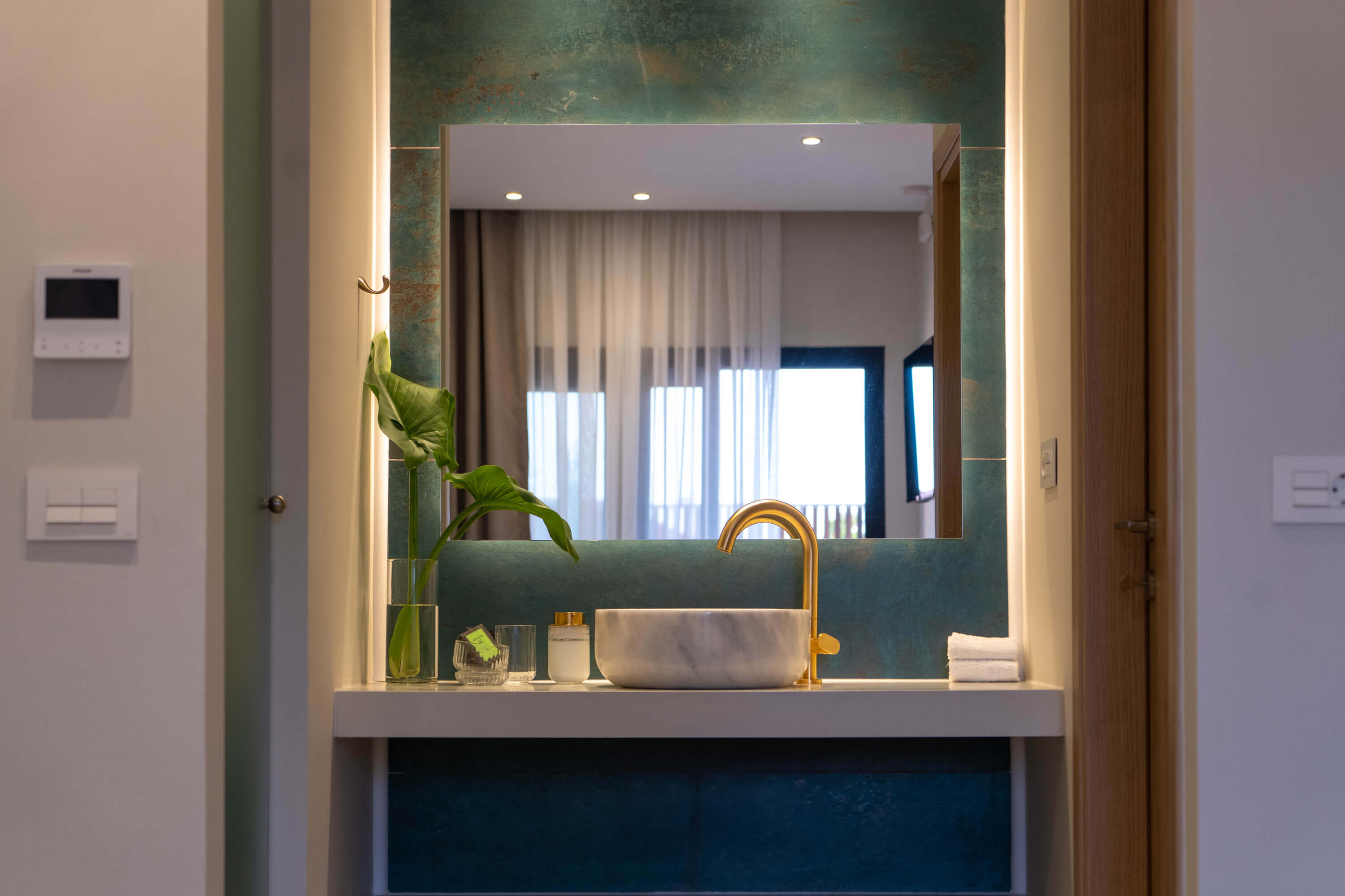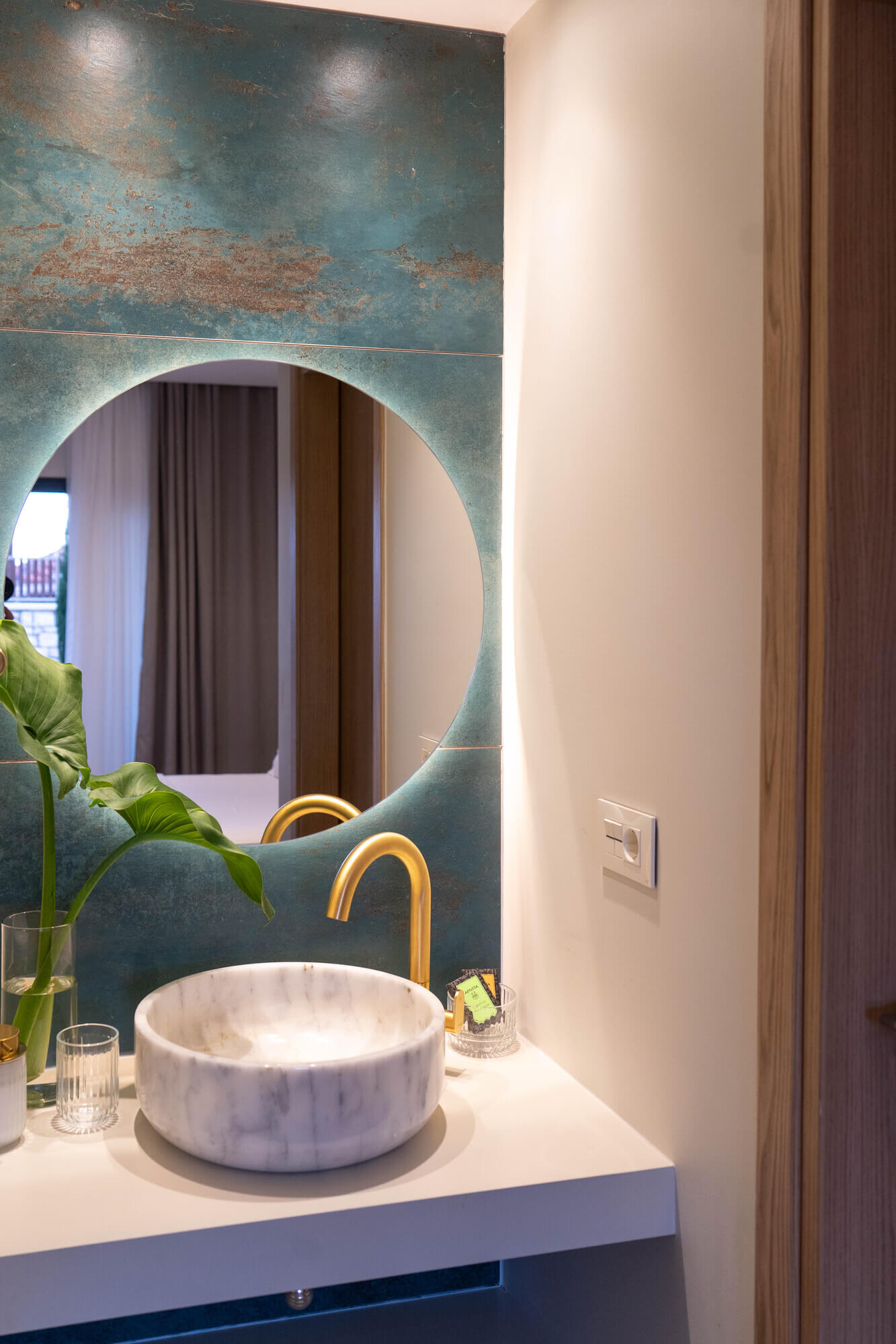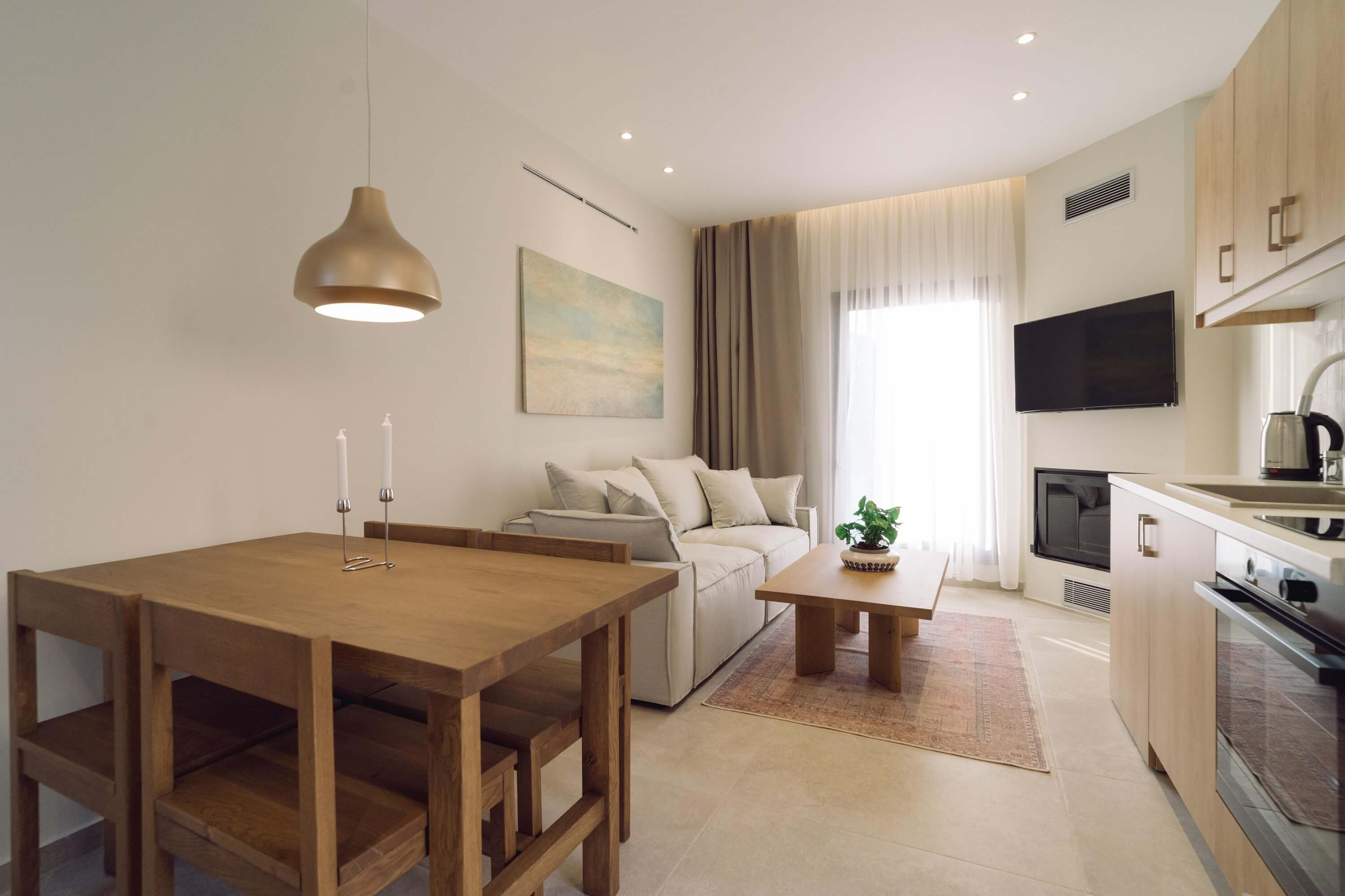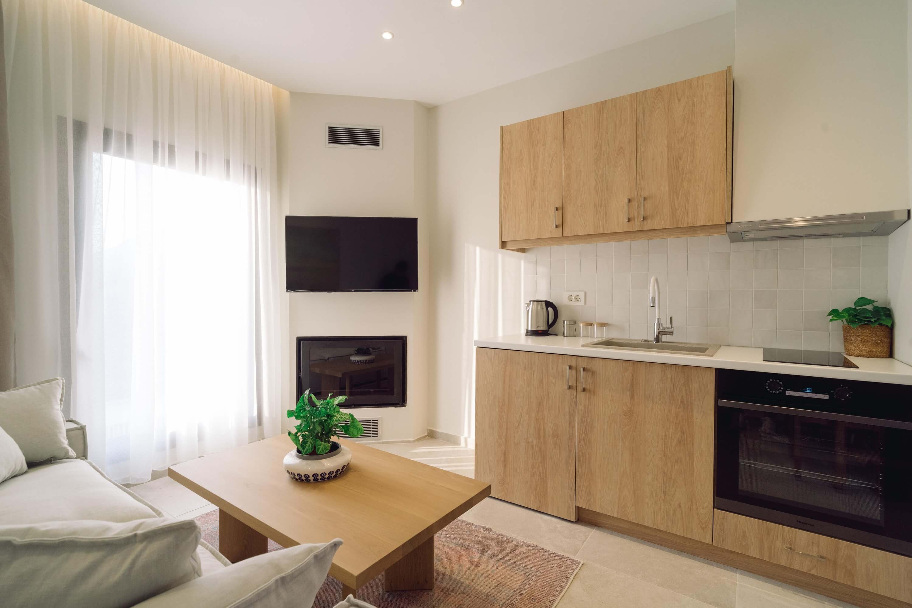 The Junior Suites can accommodate up to 3 people in a single space with a double bed and a sofa bed. The bathroom is designed with a separate rain shower, WC and external sink. There is a fully equipped kitchen and a fireplace, as well as a private outdoor jacuzzi.