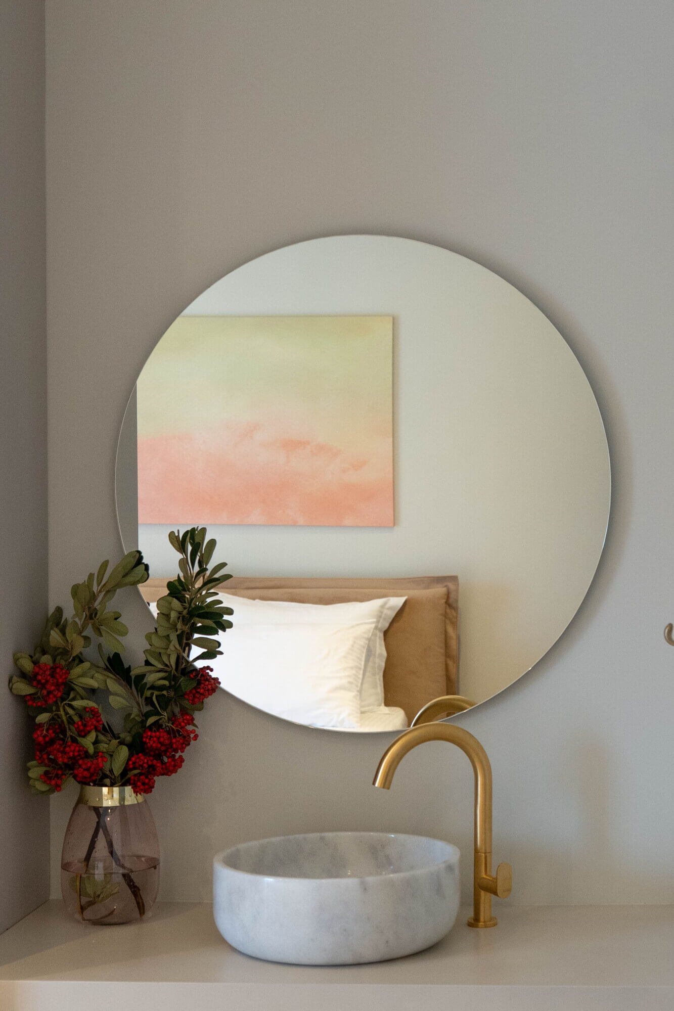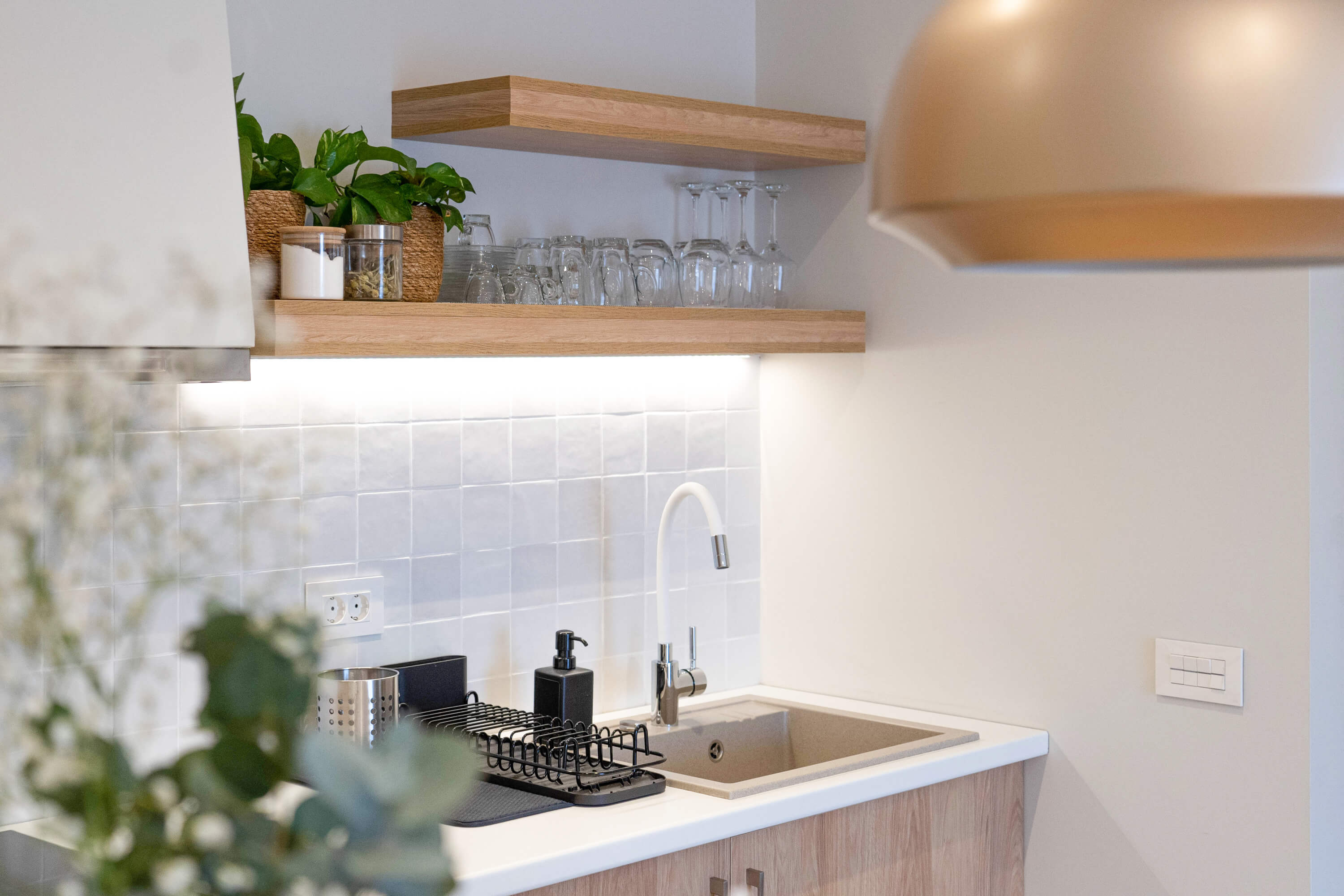 The two-bedroom suite no.6 accommodates 4 people in 2 double bedrooms. Each bedroom has its own rain shower and external sink. There is one WC and a separate living room with a fully equipped kitchen, dining table and fireplace. There are also three balconies in total, with bedrooms having their own separate balcony.