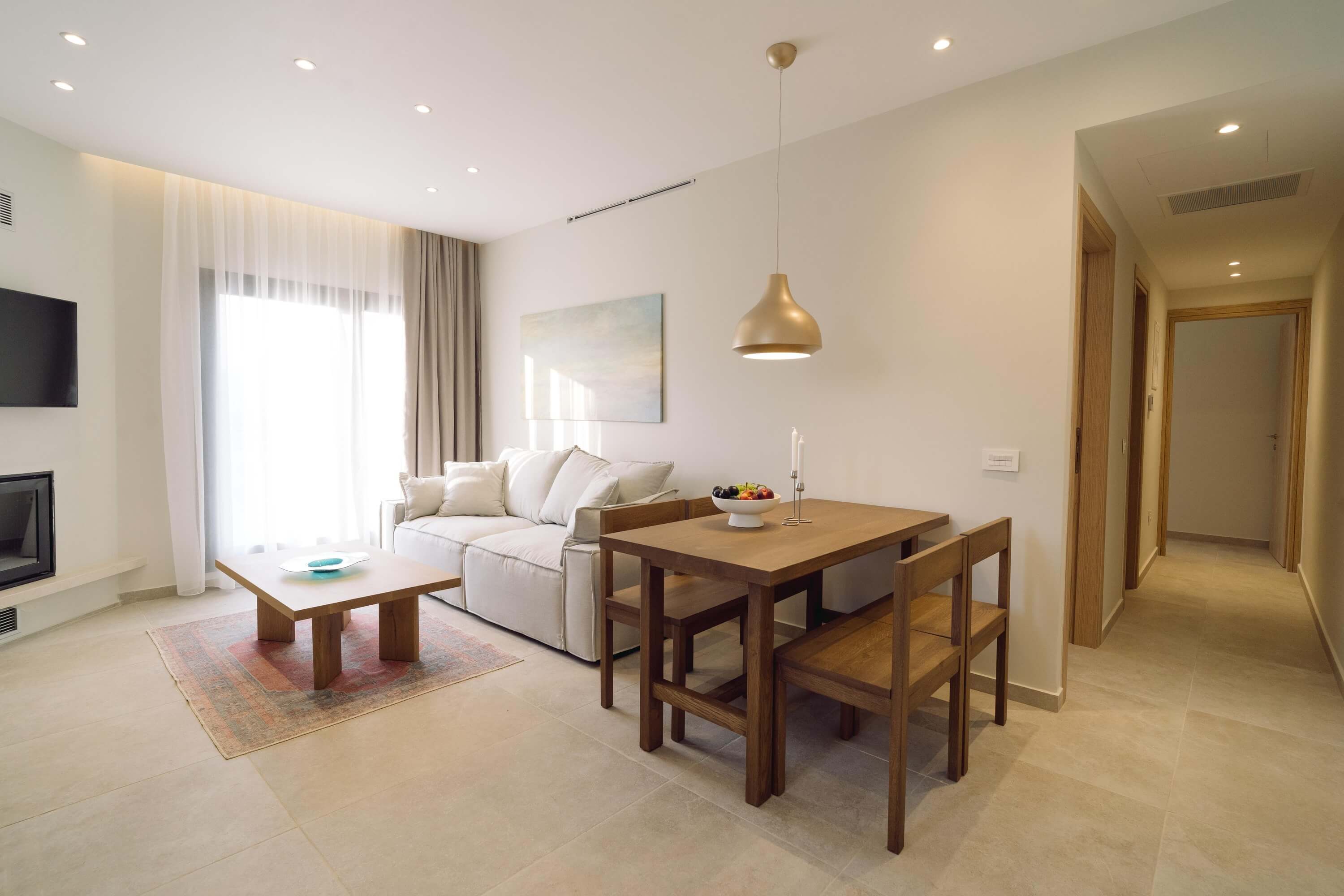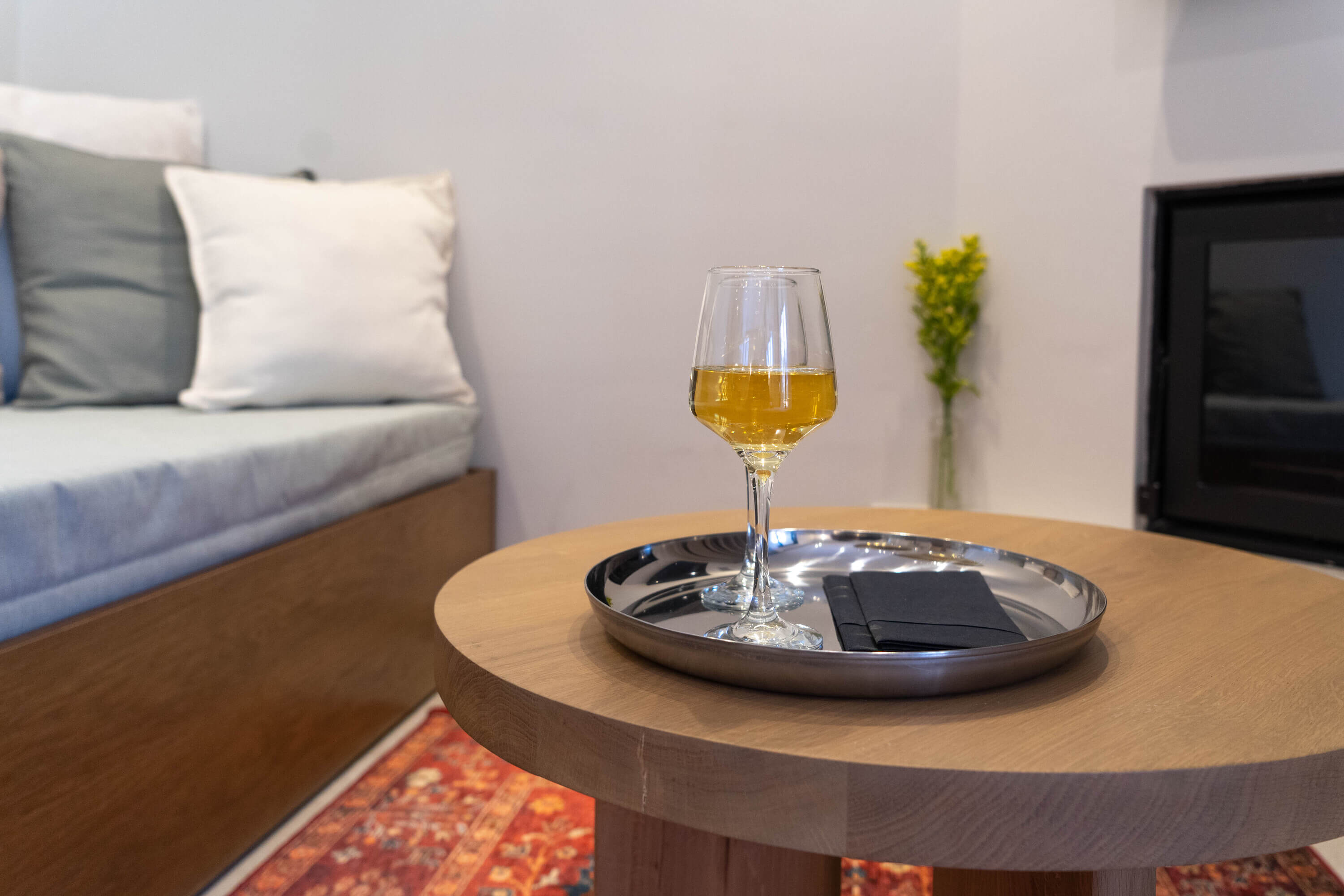 The two-bedroom suite no.7 accommodates 4 people in 2 double bedrooms. Each bedroom has its own private balcony and bathroom with a rain shower, WC and external sink. There is a separate living room with a fully equipped kitchen, dining table and fireplace.