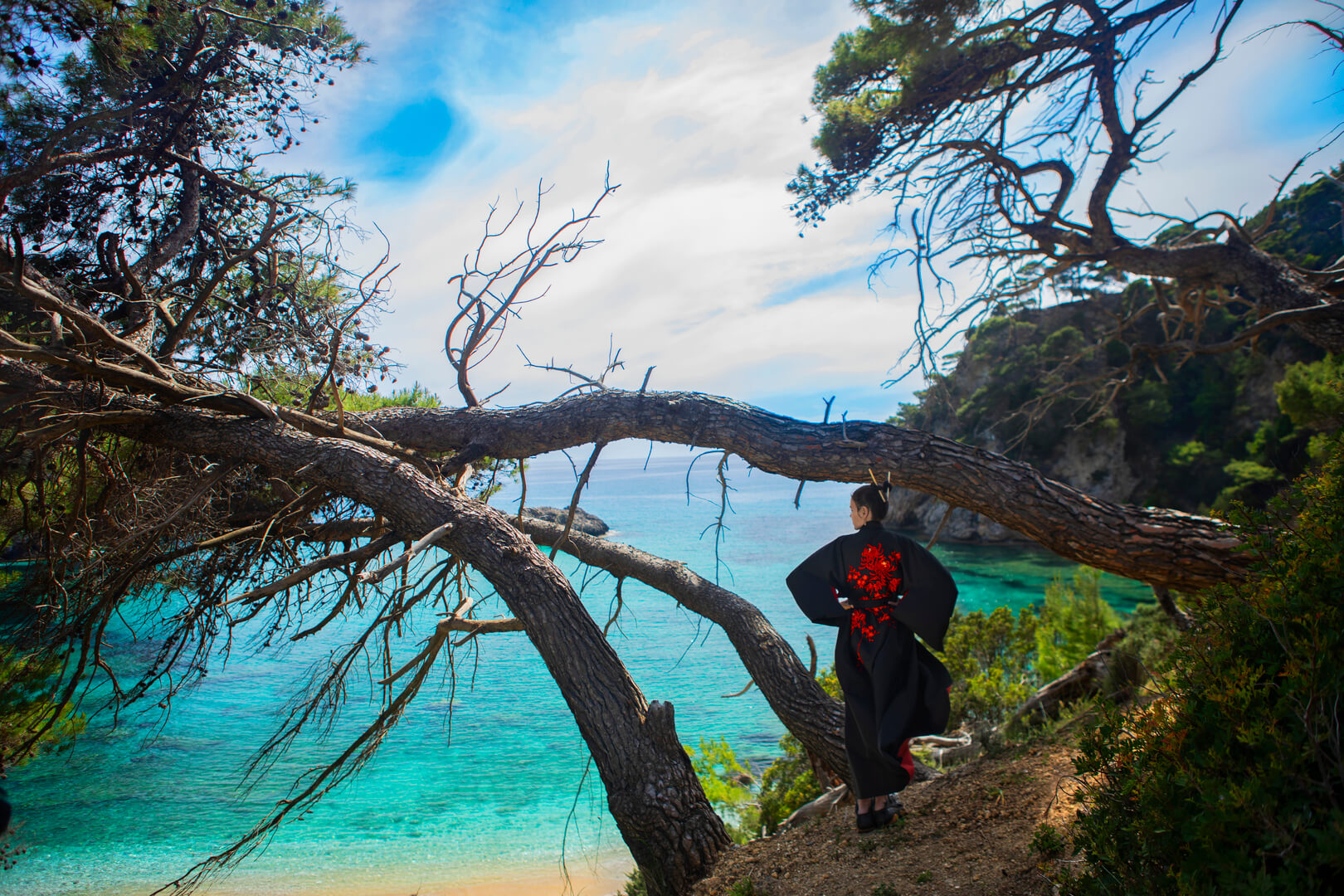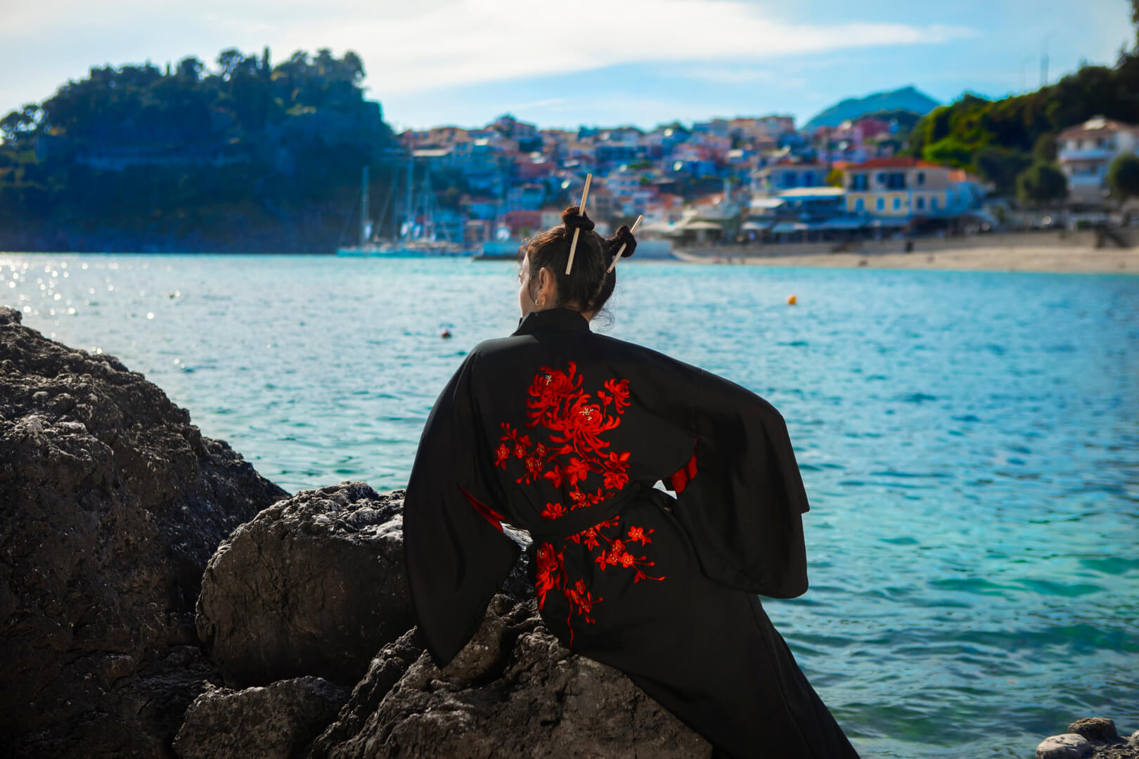 At Skala Beach, she gazed at sailboats drifting across turquoise water, as if inside a watercolor painting.